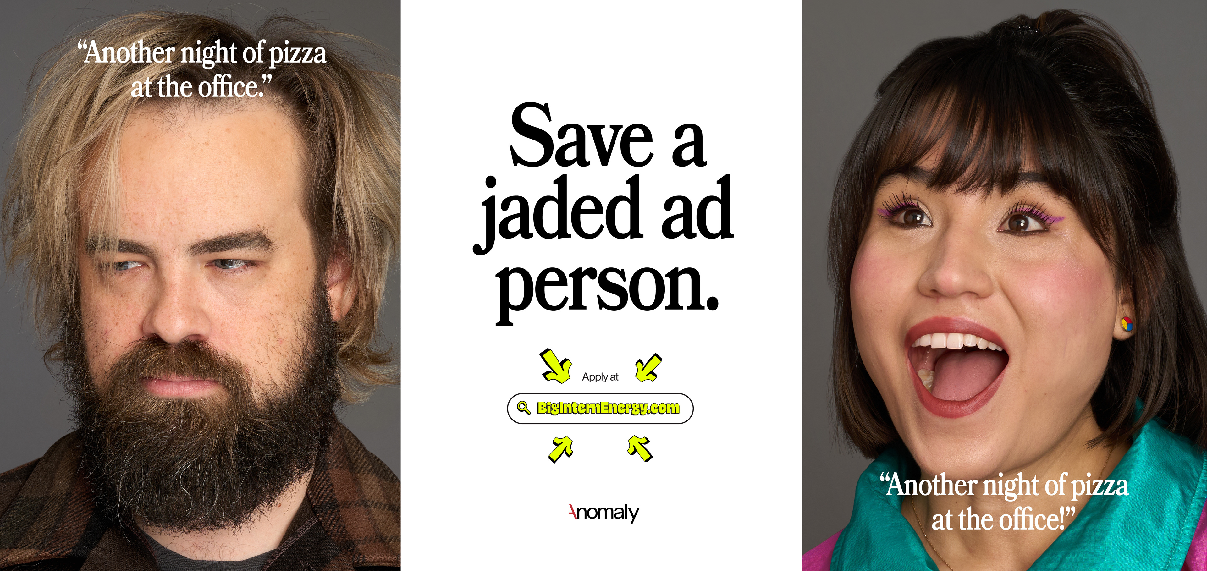We paired very excitable Anomaly juniors (who were ex-interns in the program themselves) with real jaded Anomaly staff to create this tongue-in-cheek, yet scarily true campaign.