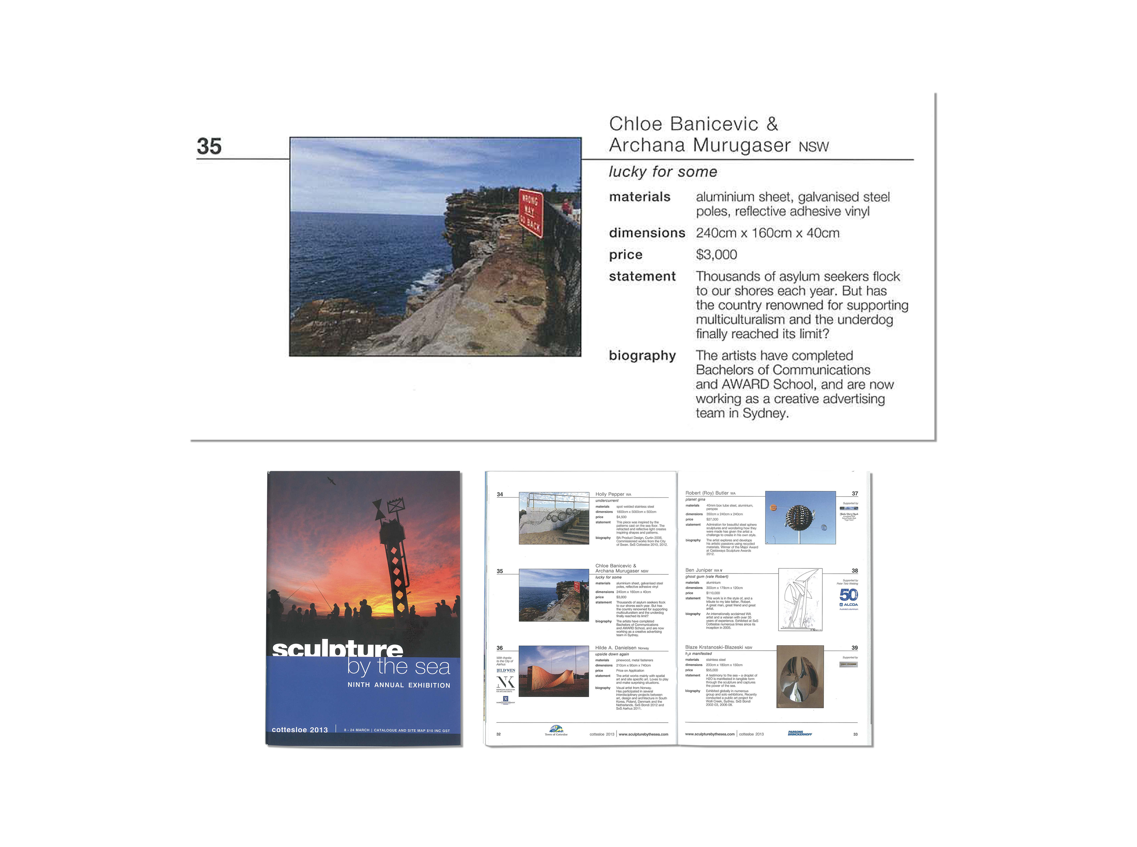 Sculpture by the Sea appears on the shores of Bondi, Cottesloe and Denmark and is a major event on Australia's cultural calendar. At the time of exhibition (2013), the refugee crisis was a major news issue in the country and we developed a concept designed to spark discussion and make people think about where they stand on the topic.